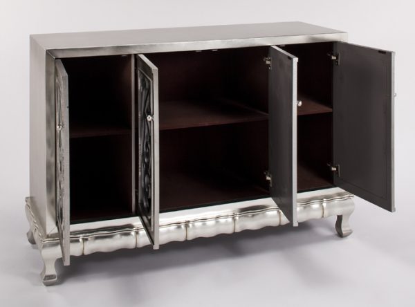 Silver leaf finish cabinet features a scroll butterfly like shape design. Has black glass insert on doors, all four doors open and has adjustable shelving in each section.